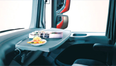 折疊桌(選裝配備)易于展開和折疊,讓你能夠在副駕駛員一側(cè)的放松環(huán)境中進餐和工作。折疊桌面非常耐磨.在天龍系列駕駛室副座前方能夠收納于后部儲物箱或前窗玻璃上方的中間儲物箱之中。折疊桌也作為天龍駕駛室的選裝配備。